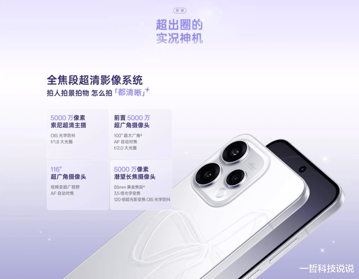 影像方面,后置三摄:5000万像素索尼LYT-600主摄、5000万像素三星JN5长焦、800万像素索尼IMX355超广角。前置也是5000万像素。